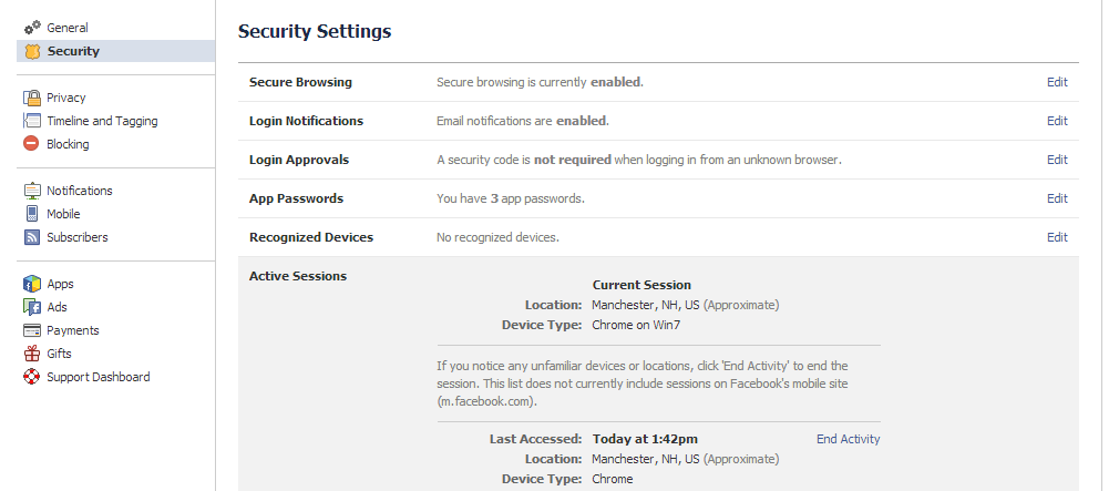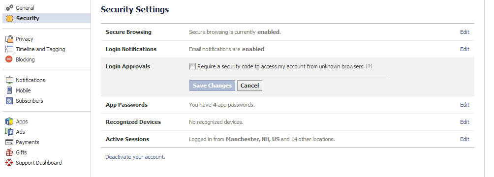 Enabling login approvals is great if you want to add a second layer of security. Similar to the idea behind Google’s 2-step verification, you must enter a pin that is sent to your phone as a text any time you want to log into your facebook account from an unrecognized device. End result: you’ll need access to your phone when you want to log into Facebook from an unrecognized computer.